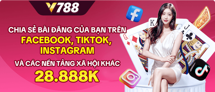 Chỉ vài thao tác đơn giản ai cũng có thể nhận được số tiền 28,888K tại v788 Com khi chỉ cần chia sẻ trang chủ nhà cái trên các nền tảng mạng xã hội như Tik Tok, Facebook, Telegram,…người chơi sẽ nhận được số tiền lớn trải nghiệm.
